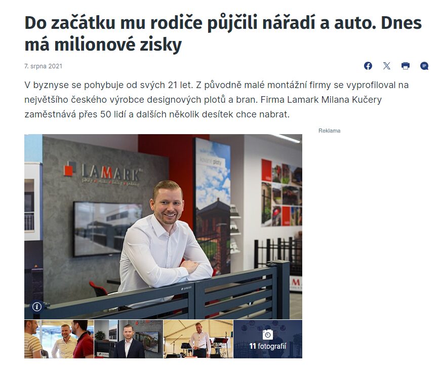 Přečtěte si o nás v článku, kde Milan Kučera, majitel společnosti LAMARK, sdílí svůj příběh o transformaci z malé montážní firmy na lídra v oblasti výroby designových plotů a bran. Dozvíte se více o jeho podnikatelské cestě, výzvách a úspěších.
